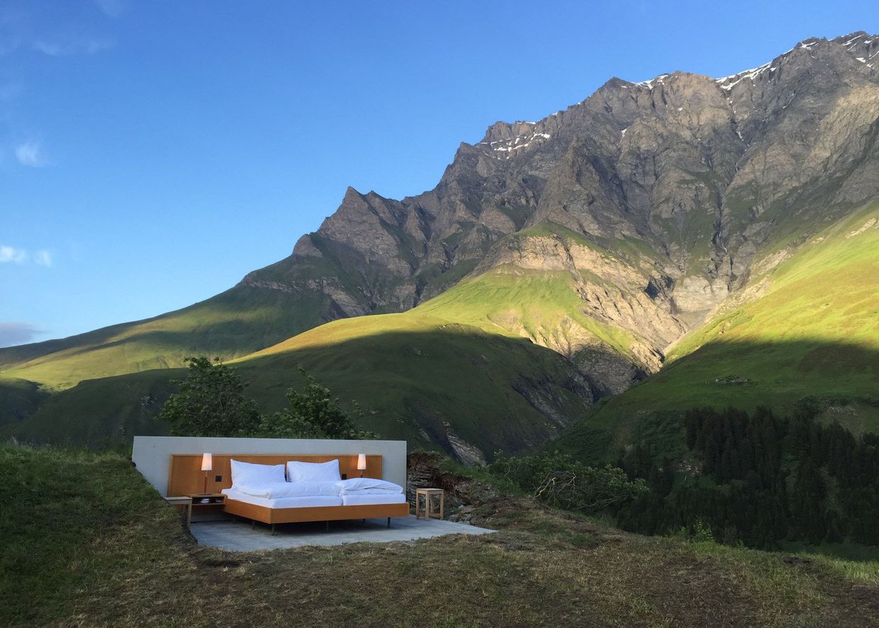If you’re a fan of minimalistic living and traveling, the Null Stern, or “zero star” hotel hidden in the Swiss Alps might be just the thing for you. The room, located 1.969 meters above sea level in the mountains of Graubünden, has no walls, roof or bathroom – and consists of only a bed with two nightstands and lamps. Local farmers work as butlers for the room, and will deliver guests breakfast in bed, and a public bathroom is a 10 minute walk away in a nearby restaurant.