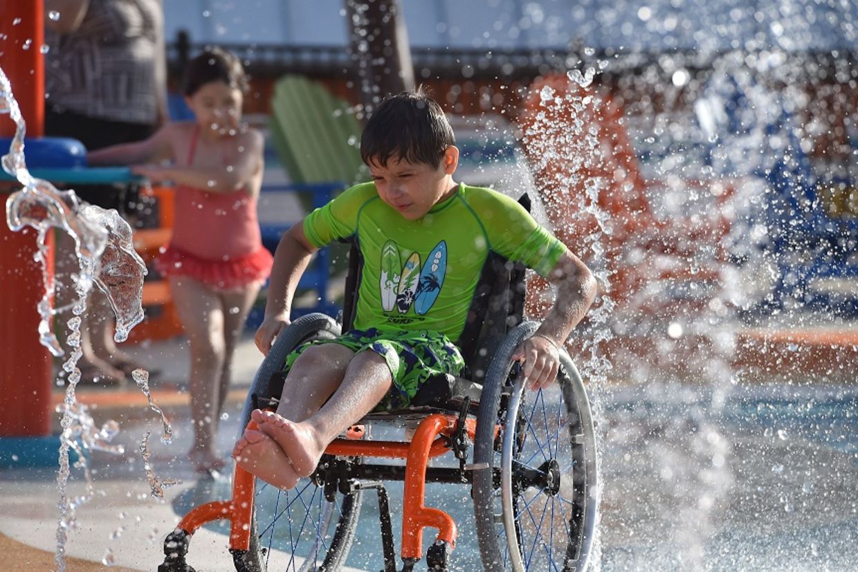 The air-powered wheelchairs are available for guests to use for free so they don't damage their own personal wheelchairs which are often times battery-operated and not conducive to water parks. Each part of the landmark facility was especially planned, developed and built with advice and consultations from doctors, therapists, special education teachers, the disability rights community and water park designers.