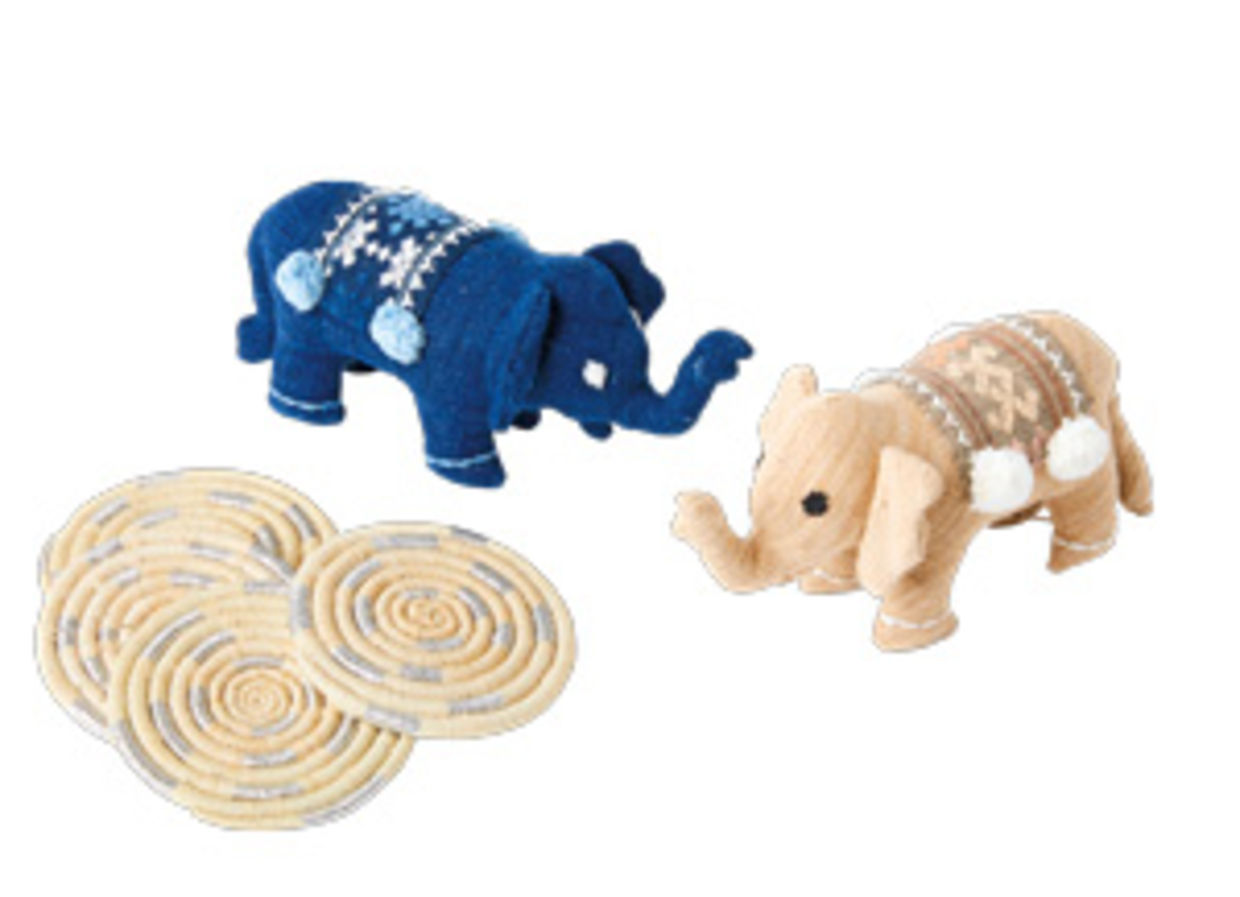 These Baby Stuffed Elephants are made by artisans in Laos using natural dyes ($24–$40, stfrank.com); Peace Coasters are created in the same traditional weaving technique of the Agaseke and handmade by women of Rwanda, providing them with socioeconomic opportunity to rebuild their communities and support their families.