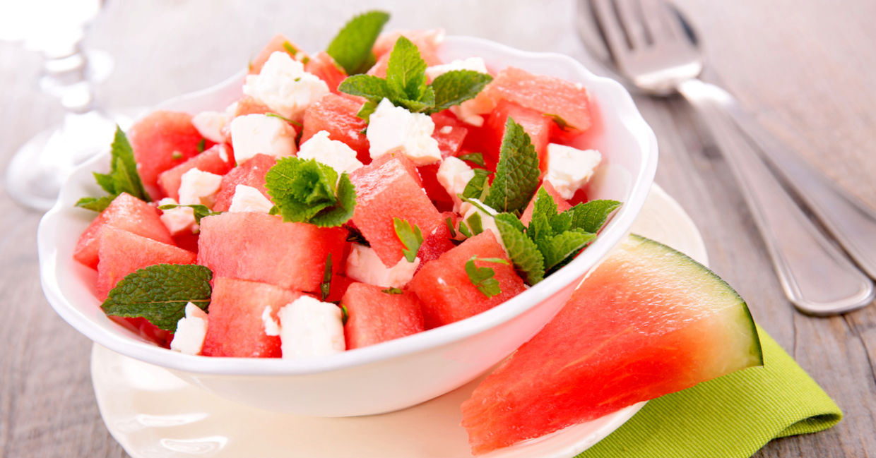 This salty and sweet salad recipe tastes super refreshing on a hot day. Crumbly feta adds a saltiness to the sweetness of watermelon, dressed with fresh mint, olive oil, and lime (or lemon).