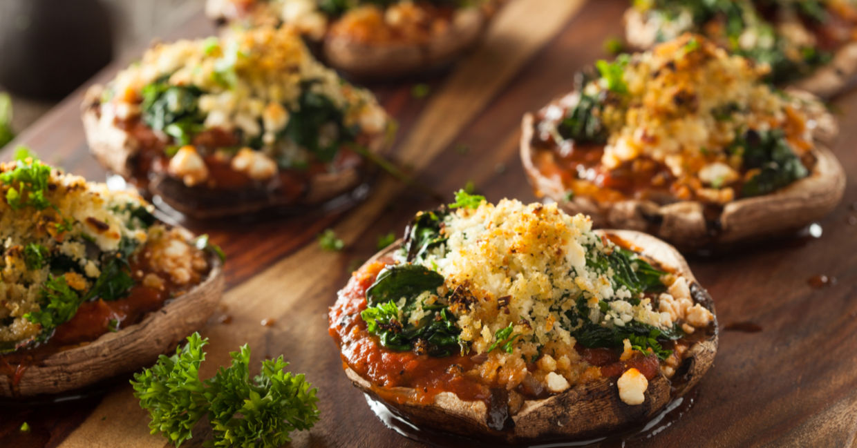 When you crave some comfort food, but want to avoid a heavy pasta dish, consider this hearty recipe as your go-to. This vegetarian recipe features large portobello mushrooms filled with a rich tomato marinara sauce, sautéed spinach, and crispy panko goat cheese medallions. For an even healthier version, cook up your own marinara sauce from scratch with fresh tomatoes to fill these mouthwatering stuffed mushrooms.