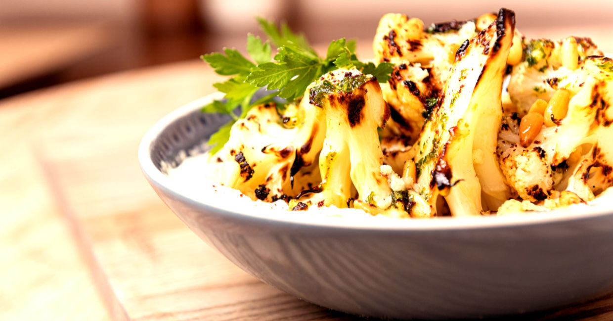 Enjoy the flavors of the Middle East with this ever satisfying cauliflower and chickpea recipe. Served hot or cold, tahini adds a creamy component over the mix of roasted cauliflower, spiced chickpeas, pungent red onion, tart lemon, and refreshing parsley.