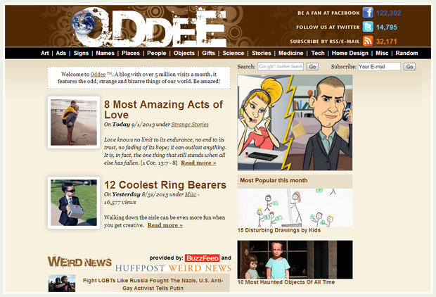 If you're one of those people who can't go past articles like 10 Coolest Home Offices or 10 Most Amazing Extinct Animals, then this is the site for you. Oddee provides hours of entertainment, browsing the realms of the odd, unusual and bizarre world around us. Entertaining for sure, and you might even learn something.