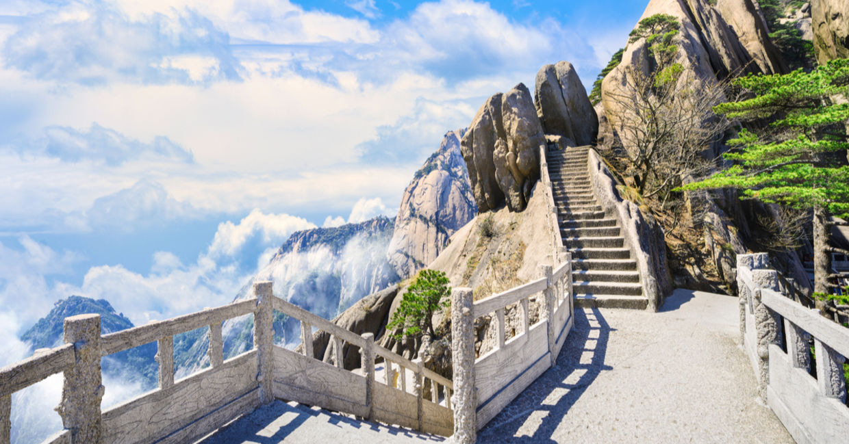 As you ascend China’s Yellow Mountain, you’ll come across crystal-clear hot springs and waterfalls. Sturdy evergreen pines grow into strange shapes on top of grotesque rock formations. A sea of clouds forms around misty granite peaks soaring over 1,000 meters (3,250 feet) high. These “floating mountains” inspired many ancient Chinese paintings and literature.