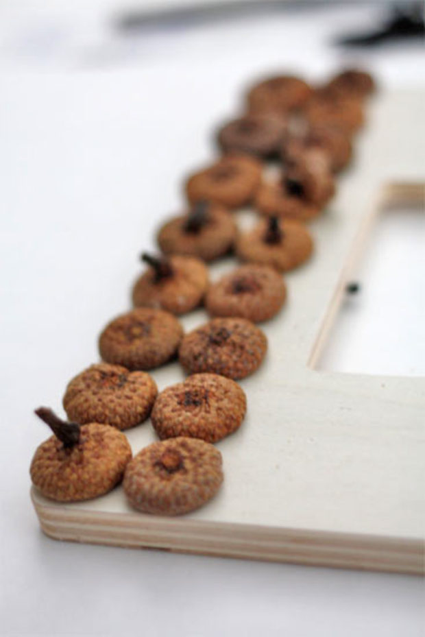 WHAT YOU’LL NEED: Acorn tops (enough to cover your frame), white craft glue, wooden frame.