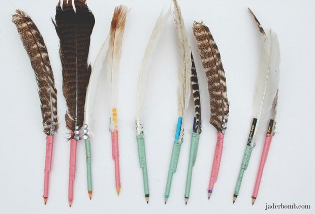 HOW IT’S DONE: Place a pencil on the back of a feather and start wrapping yarn around it. Keep wrapping until the pencil is completely wrapped in yarn. Dab the end of the yarn with hot glue and stick to the end of the pencil.