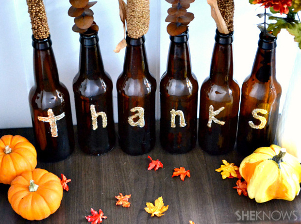 This fun DIY project adds a little sparkle and shine to your Thanksgiving table or mantle. Let your creative flag fly by choosing different phrases or words to inscribe on the bottles.