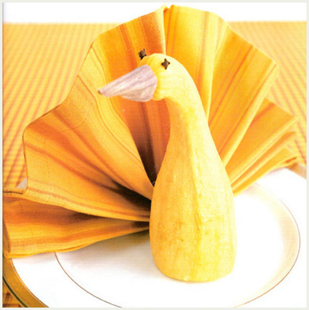 Spruce up your table with these adorable turkey napkins! Complete the look by using a gourd stem to give the turkey some shape.