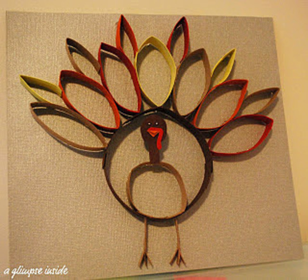 GREEN EFFECT: Instead of tossing away old toilet paper rolls, repurpose them into a decorative Thanksgiving piece that can be displayed on the front door or on the wall. Create a turkey family by asking friends and neighbors to save their old toilet paper rolls!