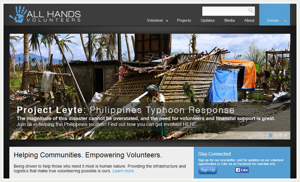 WHAT: In times of natural disasters like hurricanes, typhoons or tornados, All Hands mobilizes volunteers to work on site by repairing homes, clearing rubble and providing moral support to residents. All Hands currently has projects in the Philippines, New York and Colorado.