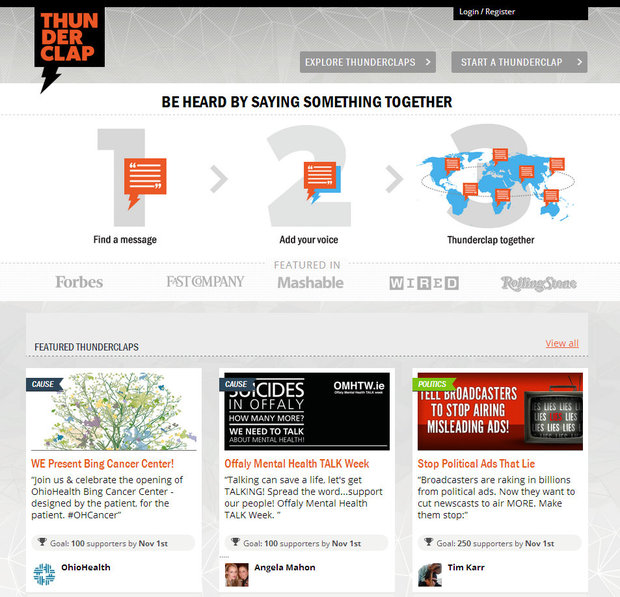 IN DETAIL Thunderclap allows a singular cause or message to be shared en masse through social media. In order for a cause to make the cut on Thunderclap, it needs to have a certain number of supporters by a specified date. If the deadline is met, Thunderclap will automatically broadcast the cause in one fell swoop.