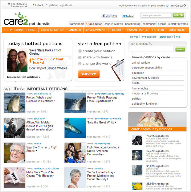 IN DETAIL A user-friendly tool to create petitions, Care2’s Petition Site is home to petitions in a variety of categories - from animal welfare to human rights.