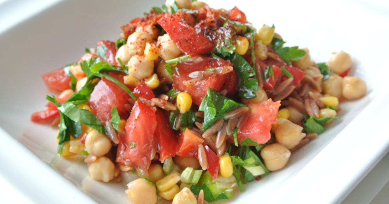 Salad dinners are perfect for warm summer evenings. Using superfood chickpeas instead of lettuce as the main ingredient makes this salad from The Kitchn both filling and nutritious. There are six main components: chickpeas, chopped fresh greens, red onions, at least two other fresh veggies like tomatoes and zucchini, an additional protein source like nuts, and a healthy salad dressing. No cooking required whatsoever.