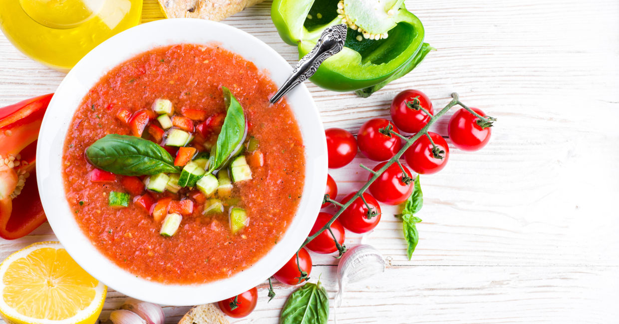 Soups do not have to be served hot but this spicy Chipotle Gazpacho from BBC Food will heat you up! All you need are fresh tomatoes, pepper, avocado, cucumber, green onions, olive oil, lime juice, red chili, almonds, chipotle paste, and spices. Just blend, cool, and serve.