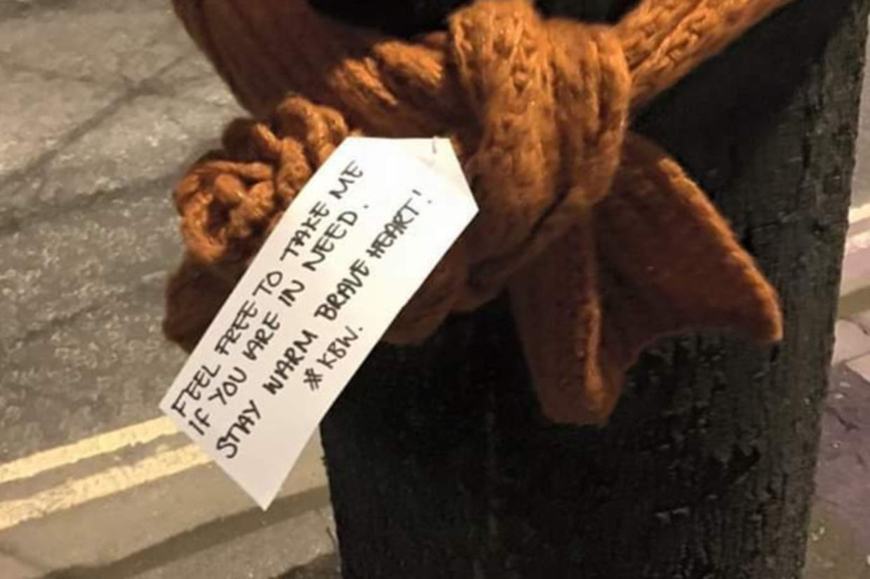 Mysterious volunteers have been leaving scarves and hats scattered in the cold city of Bristol. The winter gear has been left mostly around the city center for anyone who may need some extra warmth over the season.