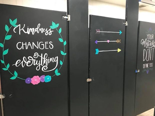 The new school theme, which is based "The Happiness Advantage" by Dr. Shawn Achor, may also extend to the cafeteria and the rest of the school bathrooms and common areas, so that everyone can take in the encouraging words. After the parents completed the project, the school shared the photos on a Facebook post where it received more than 100,000 shares.