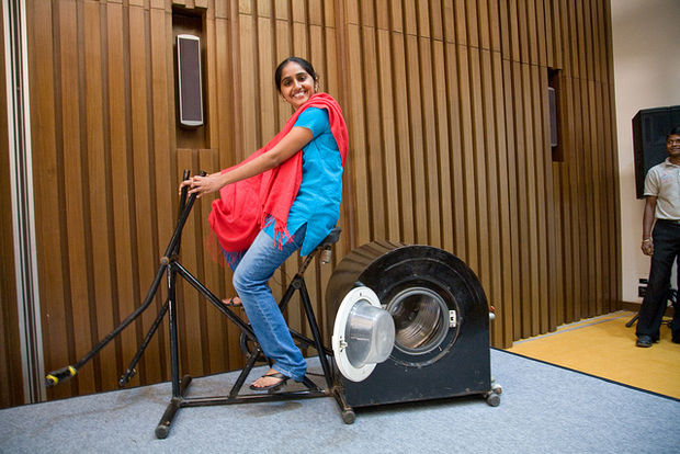 The machine has an aluminum chamber with a wire cylinder in which you place the laundry to soak in hot soapy water. The cylinder is connected to a bike chain and pedals, and the user pedals to spin the clothes. The soapy water is drained through a faucet, and then the machine is refilled with clean water for the final rinse. This simple machine is an excellent solution for families in villages like Jose’s who cannot afford electric washing machines.