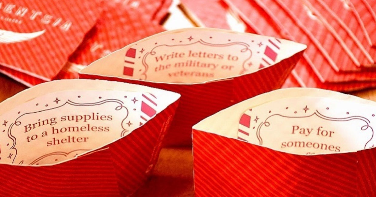 Around three years ago, Zolfo began writing good deeds that people could do in the inside of the sleeves. This included acts of kindness like putting money in the Salvation Army kettle, buying a cup of coffee or food for someone, and donating clothing to the homeless.
