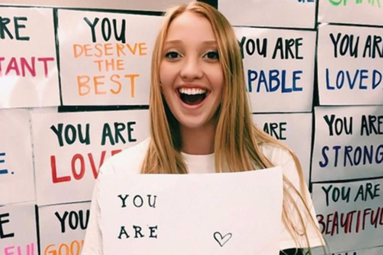 17-year-old Sabrina Astle was on a mission to turn her high school bathroom into a refuge for her teenage peers. In an effort to spread positivity, Astle covered her Laguna Hills High School bathroom in Southern California with 30 signs displaying uplifting messages such as “You are smart,” “You are doing better than you think,” and “You are beautiful.”