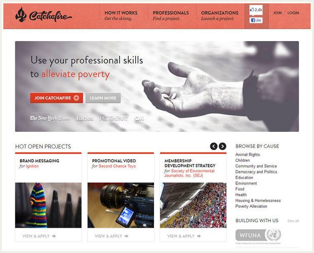 IN DETAIL Catchafire helps organizations identify their needs and lure in just the right talents to provide them with the services they need. Organizations pay a membership fee, for which they receive consultation and services from the Catchafire team. Professionals can browse listings for projects in need. Their nifty website is extra fun to navigate.